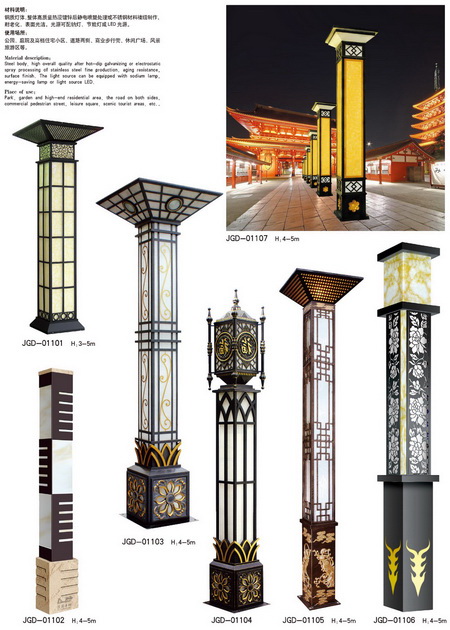 景觀燈分類:城市標志性景觀燈、仿古景觀燈、鏤空現代景觀燈、不銹鋼景觀燈、藝術造型景觀燈等