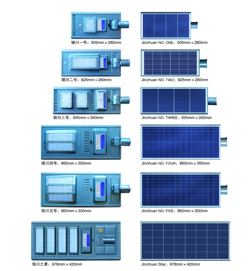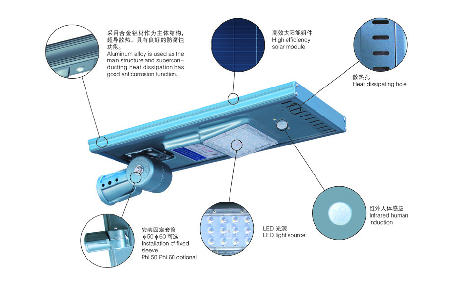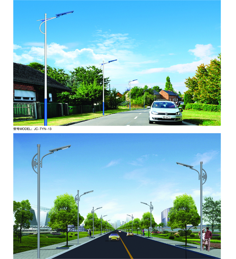 由一體化照明模塊(內(nèi)置:高效光伏組件、大容量鋰電池、微電腦MPPT智能控制器、高亮度LED光源)、燈桿組成。